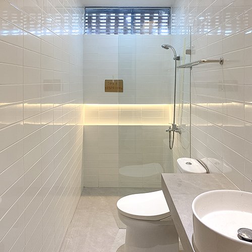 Sifat kacanya yang transparan memungkinkan pencahayaan alami tetap mengalir ke seluruh sudut kamar mandi, menjadikan ruangan terasa lebih terang, segar, dan lapang. Material yang digunakan juga mudah dibersihkan serta tahan terhadap kelembapan, sehingga memberikan kenyamanan jangka panjang.
